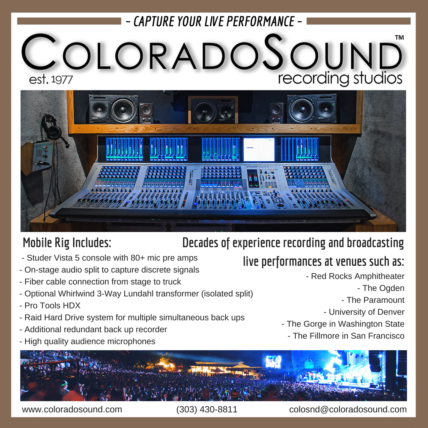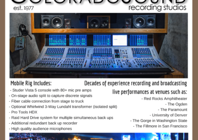 Owner Kevin Clock heads up the Mobile team.  With decades of experience capturing celebrated artists at iconic venues such as Red Rocks Amplitheatre, Mission Ballroom, The Gorge (Washington), The Fillmore (San Francisco) and many local venues like the Paramount, the Ogden and the Boulder Theatre, Kevin and the team are the perfect choice for capturing professional audio at your live show.